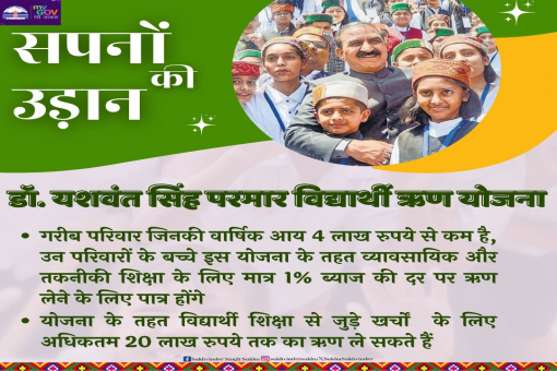हिमाचल प्रदेश सरकार द्वारा गरीब परिवार के छात्रों को उच्च शिक्षा में बाधारूप बन रही उनकी आर्थिक स्थिति अब मायने नहीं करेगी। क्योंकि हिमाचल सरकार द्वारा एक ऐसी सरकारी योजना शुरू की गई है जिसके अंतर्गत उच्च शिक्षा प्राप्त करने के लिए इच्छुक छात्रों को केवल एक प्रतिशत(1%) ब्याज दर पर एजुकेशन लोन हिमाचल प्रदेश में प्राप्त हो सकेगा। इस योजना का नाम डॉक्टर यशवंत सिंह परमार विद्यार्थी ऋण योजना है। इस योजना के अंतर्गत बच्चों को 01% ब्याज की दर पर ऋण प्रदान किया जाएगा| जिसमे से विद्यार्थी बोर्डिंग, आवास, ट्यूशन फीस, किताबें और उनकी शिक्षा से जुड़े अन्य खर्चों को पूरा करने के लिए अधिकतम 20 लाख रुपये तक का शिक्षा ऋण ले सकेंगे| डॉक्टर यशवंत सिंह परमार विद्यार्थी ऋण योजना का लाभ पाकर अब राज्य का कोई भी युवा वित्तीय संसाधनों की कमी के कारण उच्च या व्यावसायिक शिक्षा से वंचित नहीं रहेंगे|